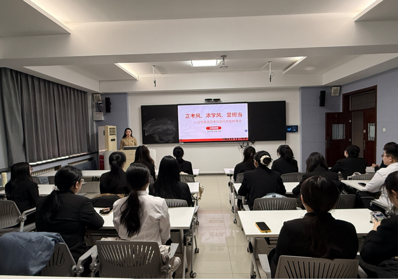 为进一步加强学风建设、严肃考风考纪,引导学生党员在诚信应考中发挥先锋模范作用,文学院党委于2025年12月12日中午汉语楼205会议室组织召开学风考风专题教育会。学院全体在校学生党员参加会议,党委书记金银松出席会议并作专题报告,会议由文学院党委组织员兼党办主任韩冰主持。