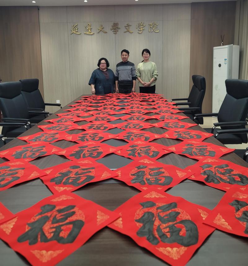 活动中,学院各办公区域洋溢着浓浓的年味。由毕老师亲自书写的“福”字整齐铺展于会议桌上,墨色饱满、气韵生动,既展现了深厚的书法功底,也寄托了对同仁的诚挚祝愿。随后,在教师书法协会成员的协助下,这些承载祝福的“福”字被逐一张贴到文学院每一间教师办公室门上,红纸映门、墨香满院,成为校园中一道温暖而独特的迎新风景线。