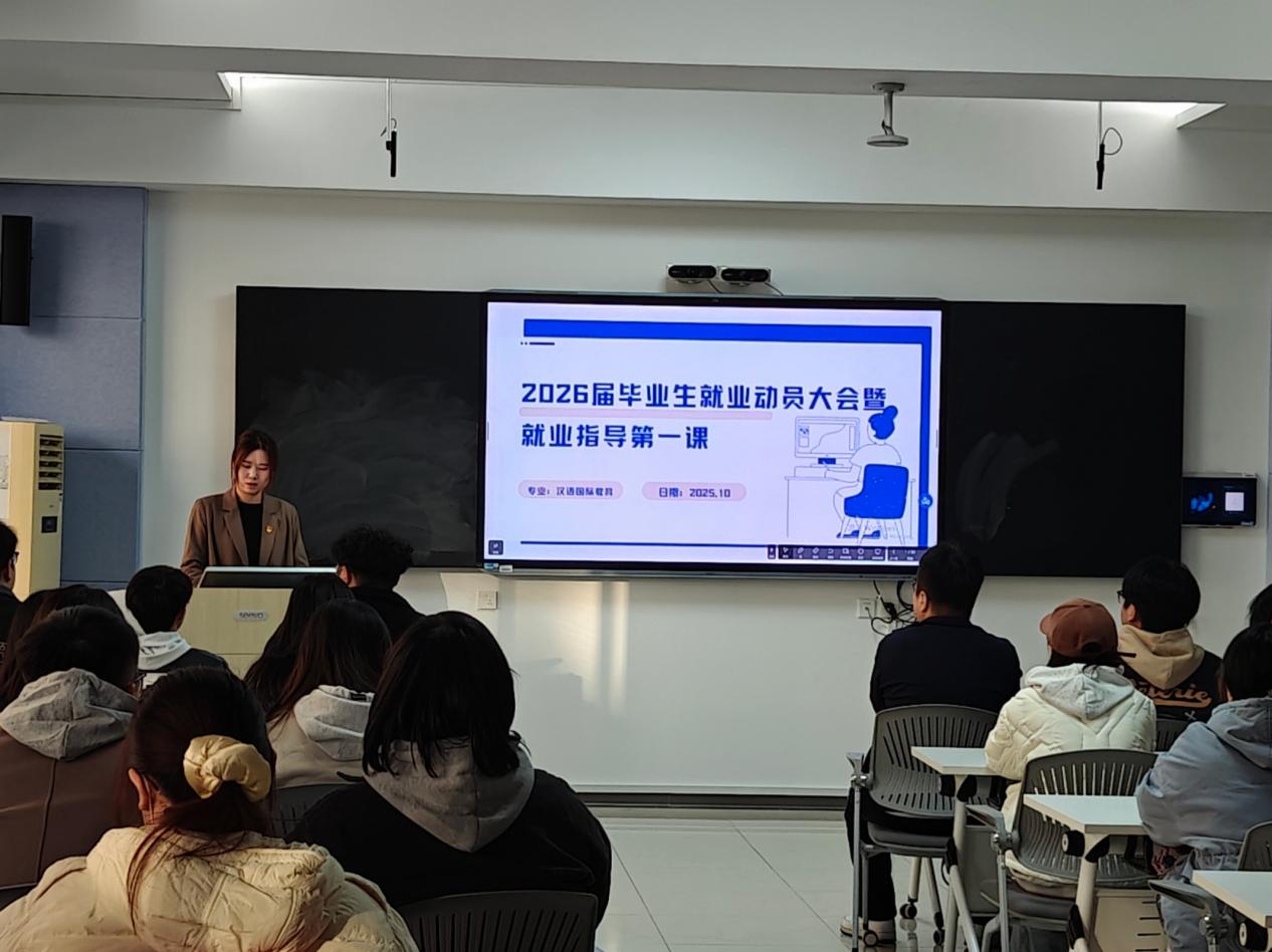 为帮助毕业生认清就业形势、明晰政策支持、做好求职准备,助力其顺利迈入职场。2025年10月,文学院汉语国际教育专业召开2026届毕业生就业动员大会暨就业指导第一课。班会由专业辅导员周彤主持。