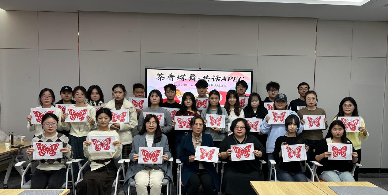 本次活动紧扣“青年视角下的文化互鉴与文明交流”核心主题,旨在通过沉浸式体验让学生感受APEC精神内核,搭建中韩文化沟通的青春桥梁。活动精心设置“世界茶叙”与“蝴蝶剪纸”两大特色环节,层层递进传递文化温度。在“世界茶叙”环节,师生围坐一堂,共同品鉴2025年APEC会议指定礼茶人参乌龙,茶汤的醇厚香气中,大家结合中韩文化交流的历史脉络与现实意义,畅谈青年一代在国际交往中的责任与担当,思想的碰撞与茶香相互交融;在“蝴蝶剪纸”环节,学生们拿起剪刀、裁折纸页,用心创作了33只形态各异、寓意美好的蝴蝶作品——蝴蝶象征着飞翔与共生,既承载着“从庆州飞向深圳”的文化延续期许,也寄托了对亚太地区合作共赢的美好愿景。值得一提的是,2026年中国深圳将迎来第33届APEC会议,2025年恰逢中韩建交33周年,“建交33周年·33只蝴蝶·33届APEC”的巧妙呼应,形成了极具纪念价值与象征意义的文化符号,让活动的文化内涵更显深厚。