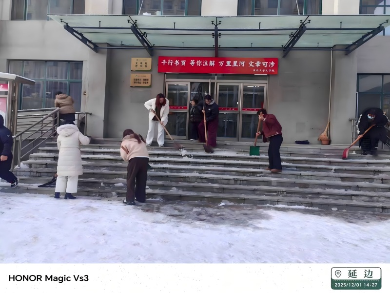 为切实保障师生出行安全,解决冰雪天气带来的通行隐患,12月1日下午,文学院学工办组织全体辅导员对学院楼前台阶进行除冰工作,用实际行动践行“我为群众办实事”理念。