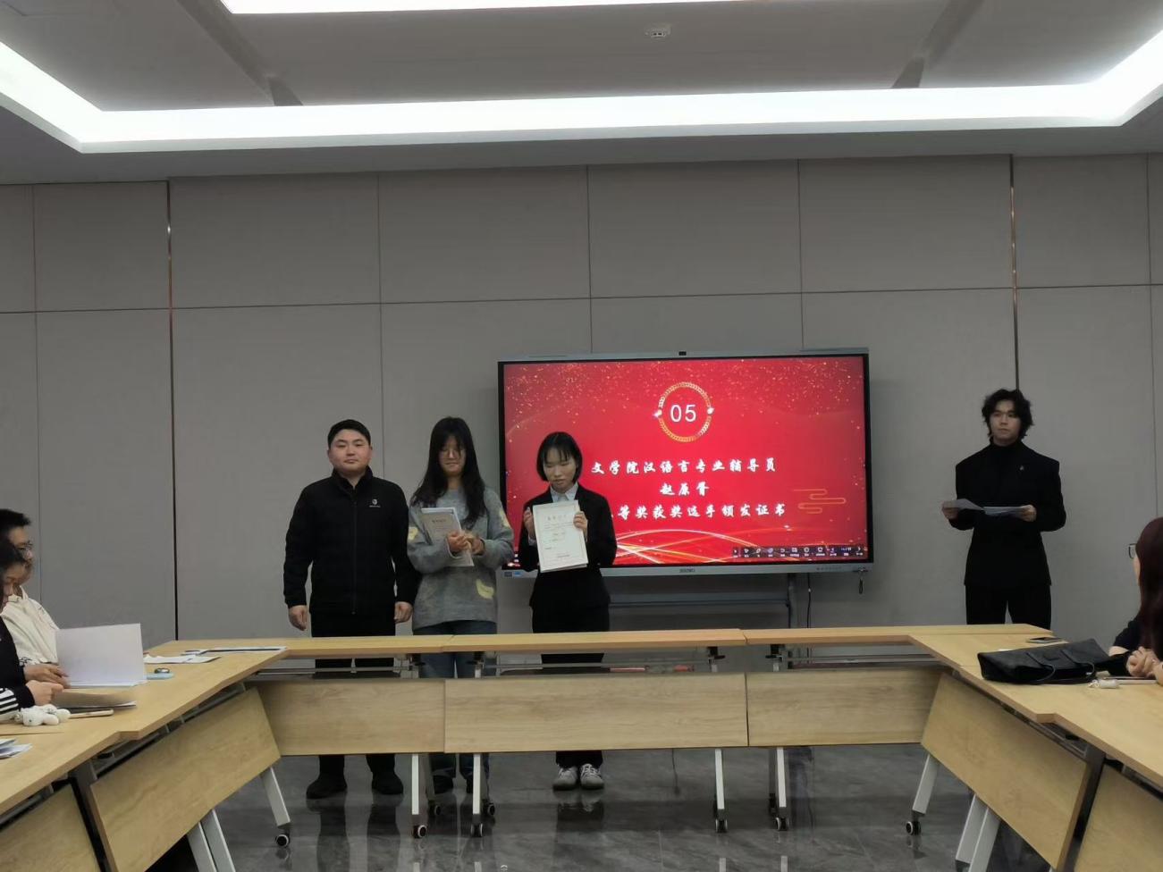 2025年12月12日,文学院2025年“经典润心·笔墨愈情”心理赋能活动颁奖仪式在学校一站式学生社区党团活动室圆满举办。本次活动是文学院结合专业学科优势与育人目标,聚焦中华文化经典篇目,开展的心理健康工作“一院一品”特色活动。文学院党委副书记韩美兰、学工办主任全香花、汉语言专业辅导员赵原胥、获奖作品代表以及2025级学生代表参加了本次活动。