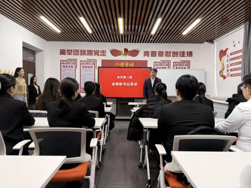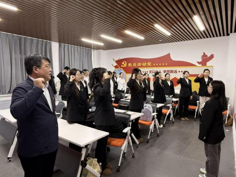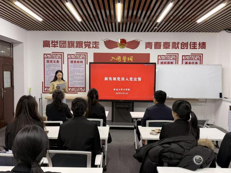 为加强学院党组织建设,扎实做好党员发展与教育工作,文学院于12月12日下午在汉语楼101党团活动室举行2025年下半年新发展党员入党宣誓仪式。文学院党委书记金银松、2025年下半年全体新发展党员及学生党员代表参加活动。会议由党委组织员兼党办主任韩冰主持。